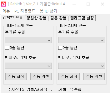 메이플스토리 유틸자료실 () Rebirth_2.2[추옵매크로] Boiru14 2023.08.27 - 10:15 2023.06.12 - 09:23 340 4 [ 서버 이전 완료 ] 무기류 추옵 미완성 Attached file [ Rebirth ]_06_12.zip 17.27MB 151-1.PNG 9.0KB 0 이 게시물을.. N 0 0 373 클라로컬garegdas 4 Boiru14 Boiru14 님의 최근 글 고버전 사냥 매크로 (밑에자료꺼는 안되길래 FIX) 919 11 2023 08.04 Rebirth_2.2[추옵매크로] 340 4 2023 06.12 Cube_3.2[큐브매크로] 1633 7 2023 06.12 Rebirth_2.1[추옵-무기미완성] 112 1 2023 06.11 CUBE 3.1[탤그봇 자동알림] 135 1 2023 06.11 Boiru14 님의 최근 댓글 성능자체는 확인안함 구동여부만 고침 테스트상 그냥 저냥 큰기대 하지마시길 2023 08.04 --종료-- 2023 07.27 -종료- 2023 07.27 작동간 오류 쪽지 문의 바랍니다 2023 06.12 작동간 오류 쪽지 문의 바랍니다. 2023 06.12 글쓴이의 서명작성글 감추기 댓글4 0 Boiru14 2023.06.12 - 09:24 #12925189 작동간 오류 쪽지 문의 바랍니다 0 asddsa22 2023.07.07 - 14:41 #13034874 실례가 안된다면 009901@naver.com 메일로 보내주실수있을까요.. 0 Boiru14 2023.07.27 - 08:14 #13119101 --종료-- 1 0 밍꾸 2023.08.27 - 10:15 #13261728 파일 업데이트 하라고 오류납니다. 댓글 쓰기 에디터 사용하기 닫기 글쓴이 비밀번호 댓글 등록 view_headline 목록