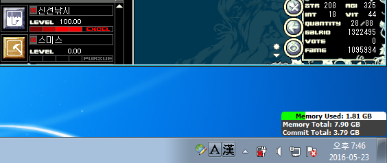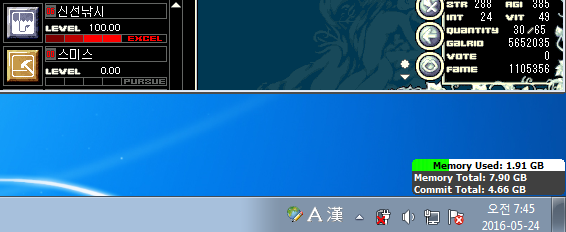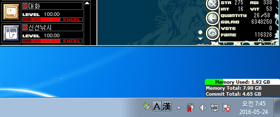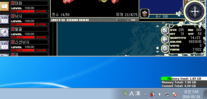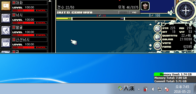 1) 직접 만든 자동수리 매크로를 사용하여 신선낚시대 2개만 이용하여 실험함.