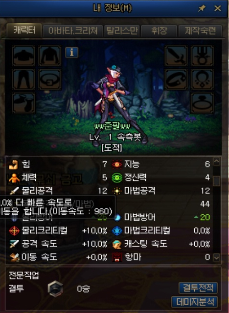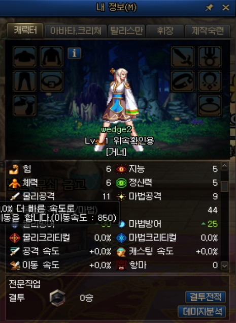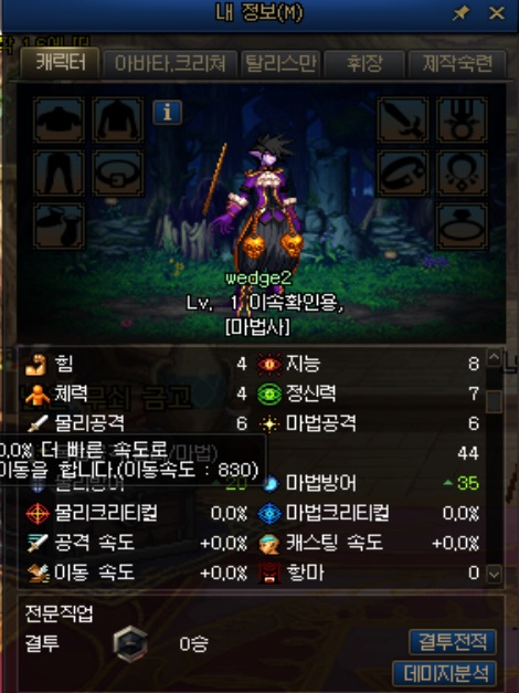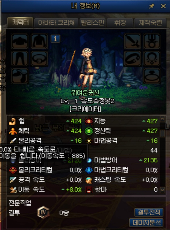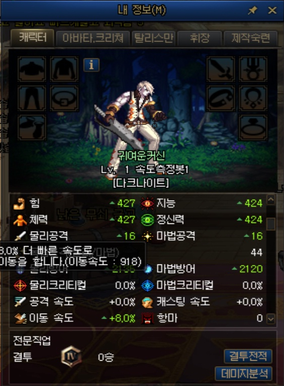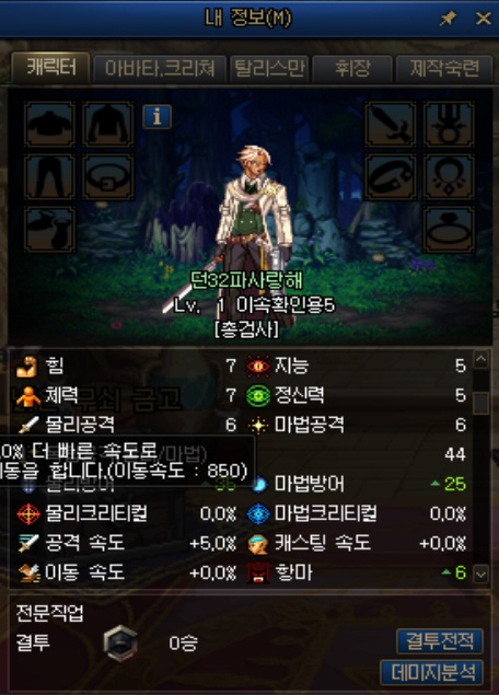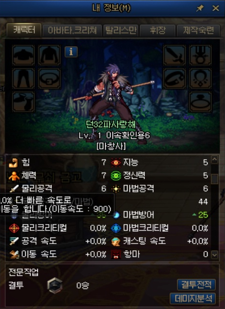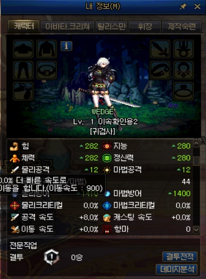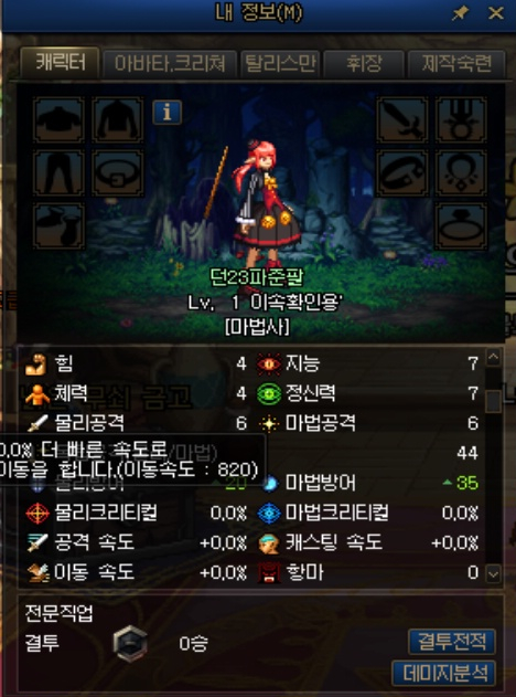 외전 캐릭터는 특이하게 아무 장비를 착용하지 않아도 이동속도가 8%가 붙어 있었습니다.