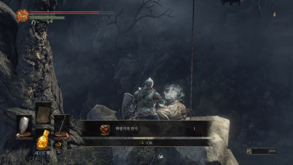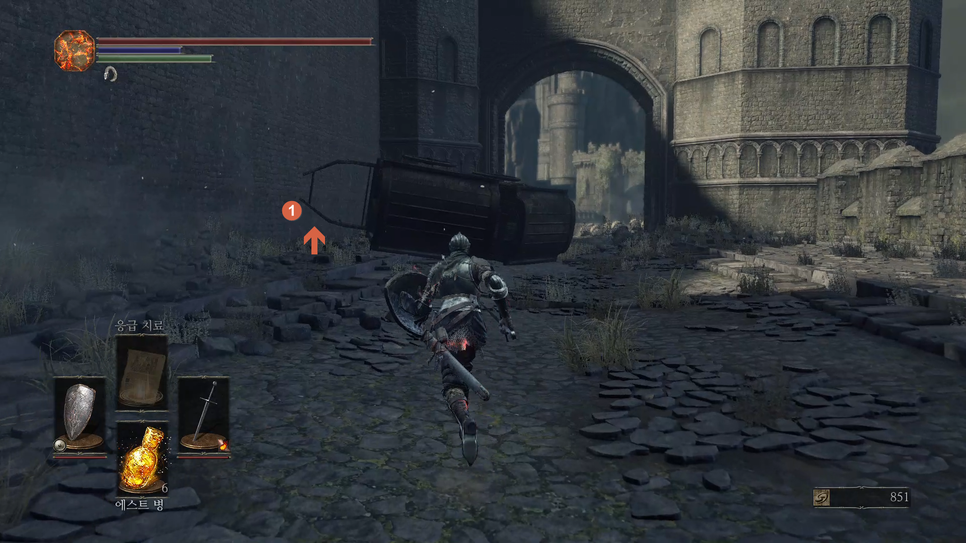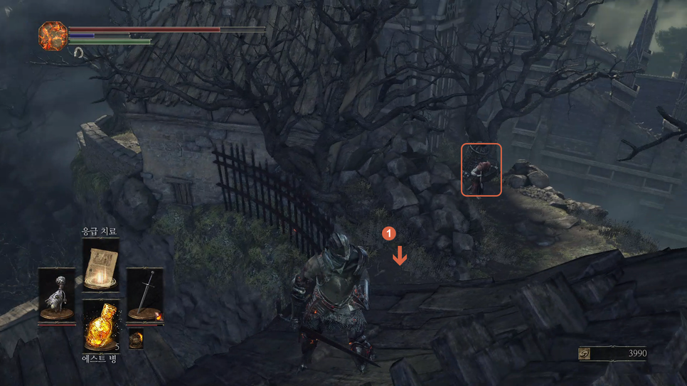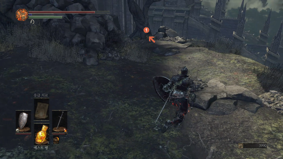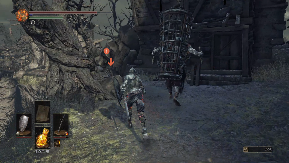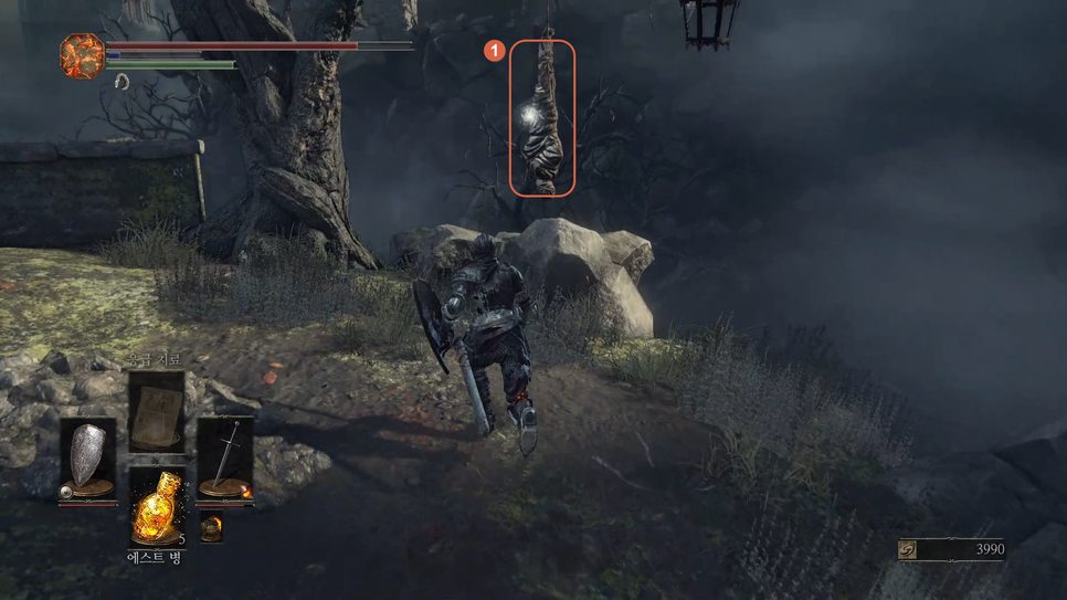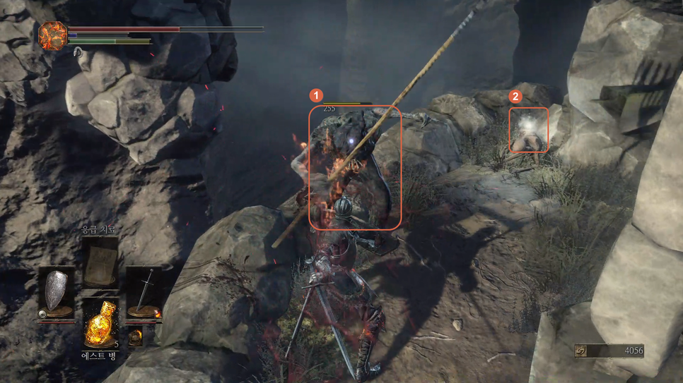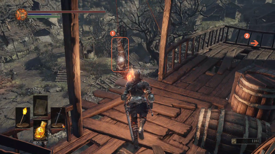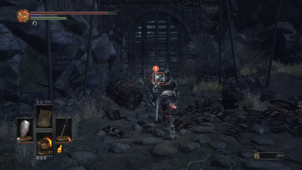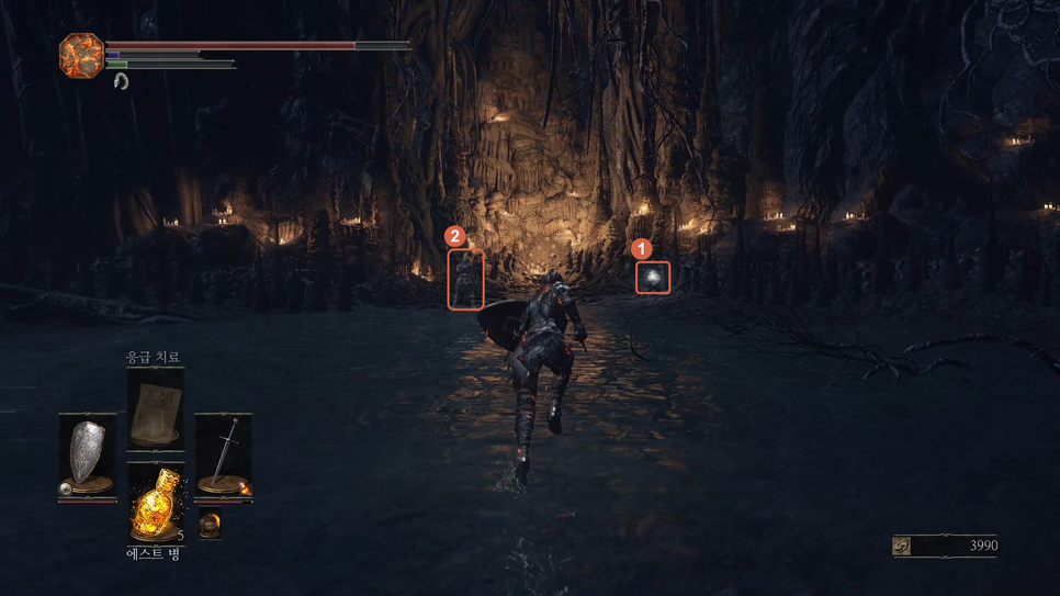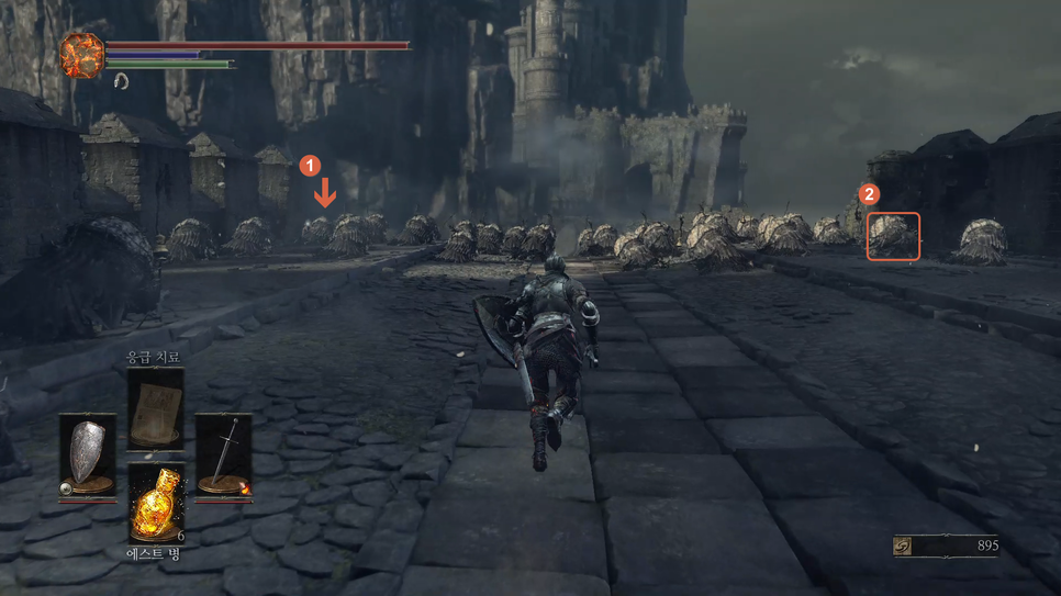 1번 "버려진 유해의 거대한 소울" 을 획득하고 2번 방향으로 갑니다.