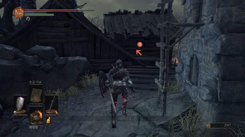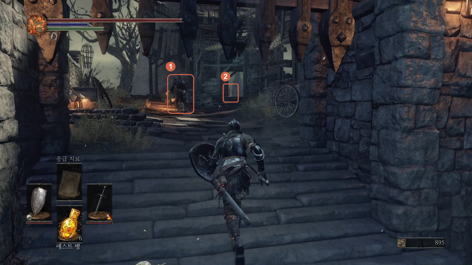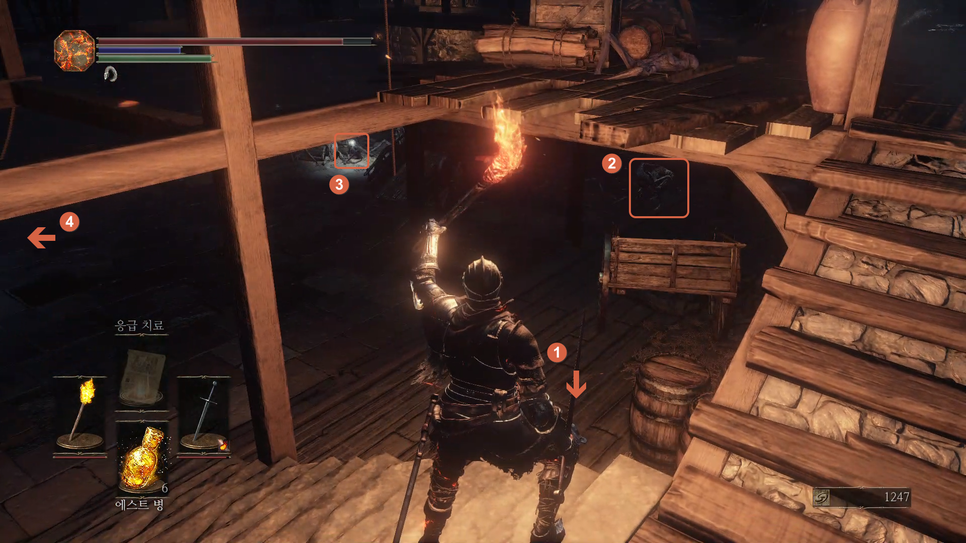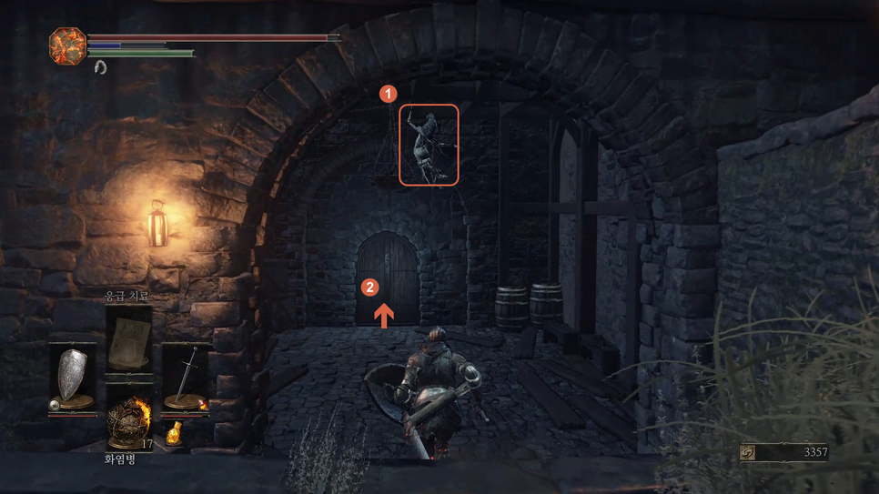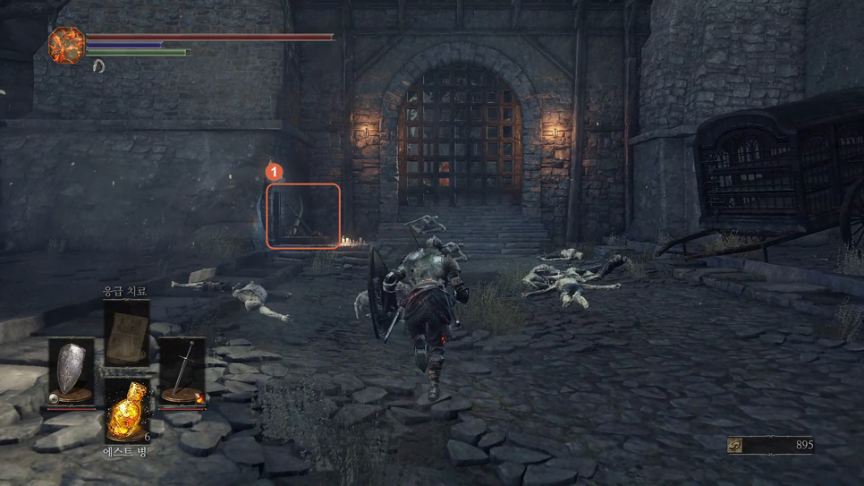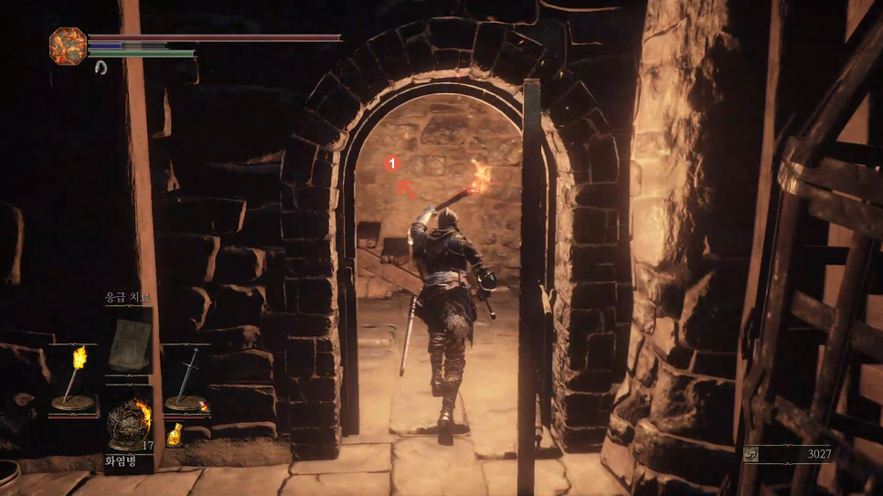 문이 열리면 앞에 몹(1번)을 처리해주고 화톳불(2번)을 밝혀줍니다.