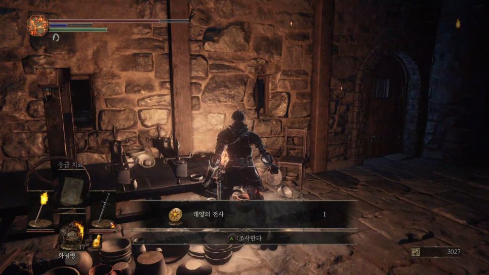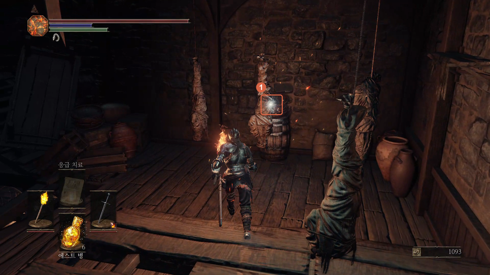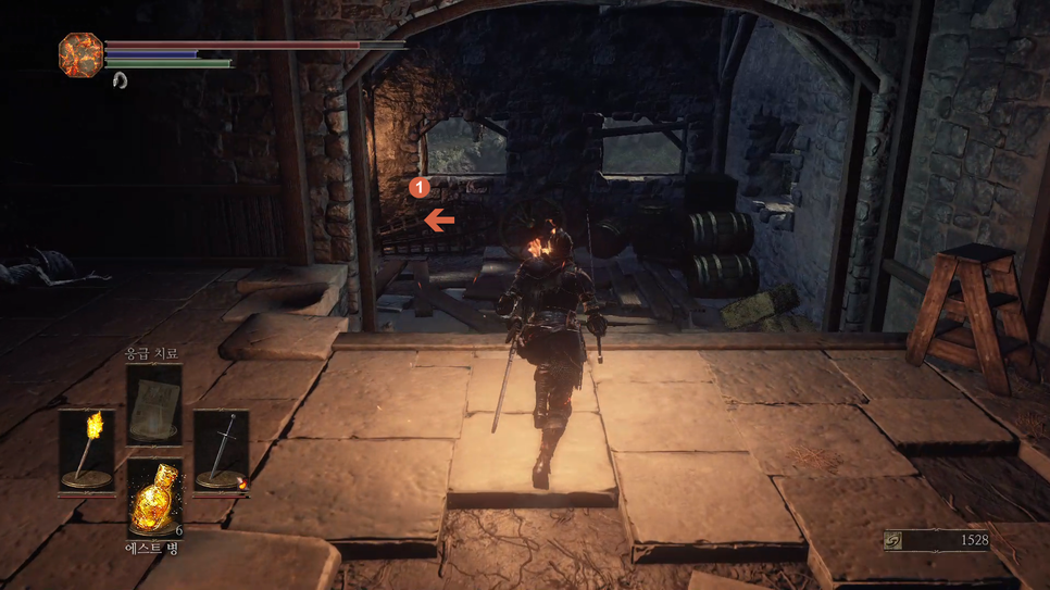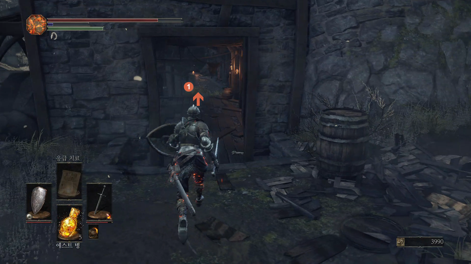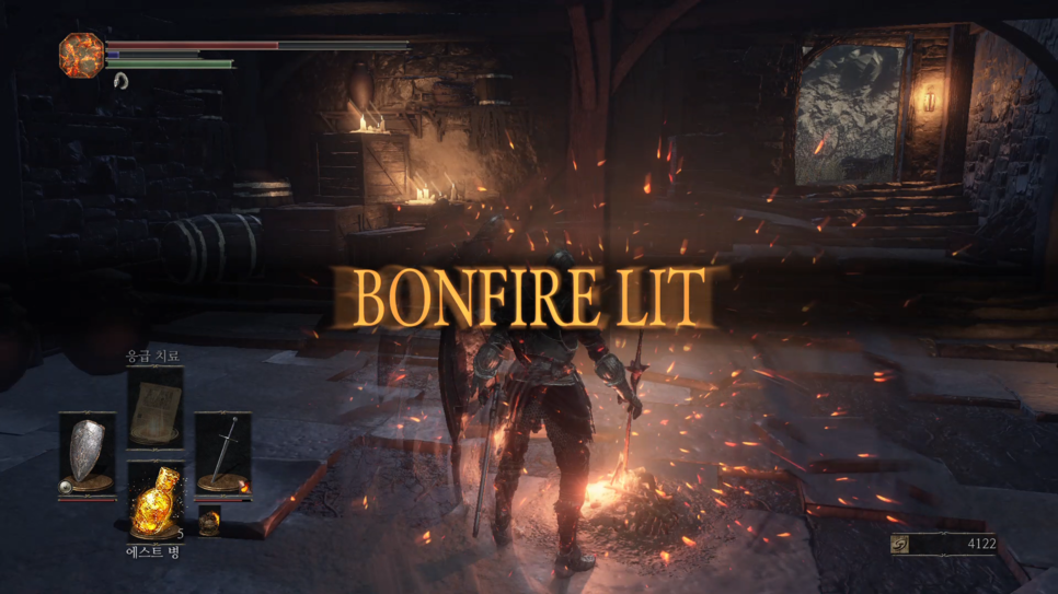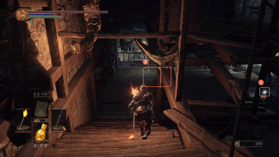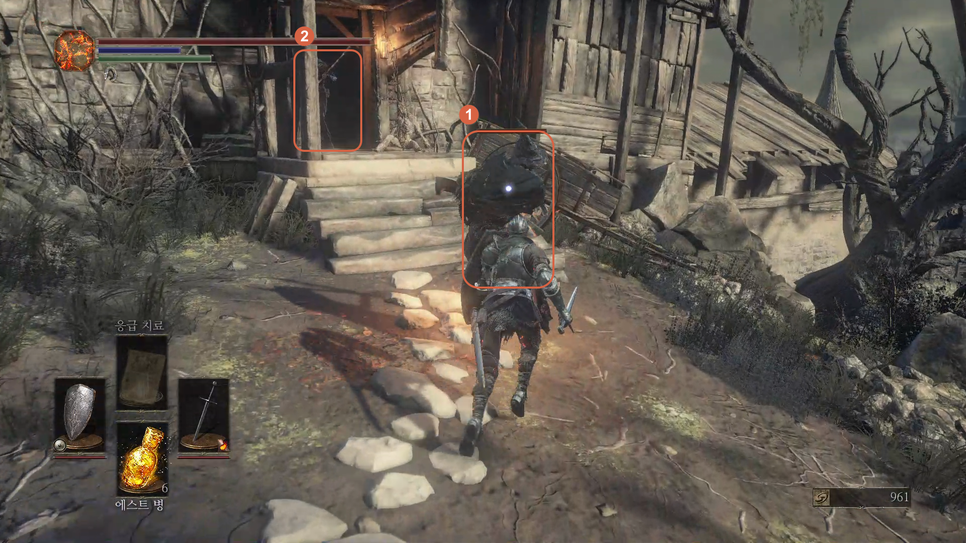 문이 열리면 앞에 몹(1번)을 처리해주고 화톳불(2번)을 밝혀줍니다.