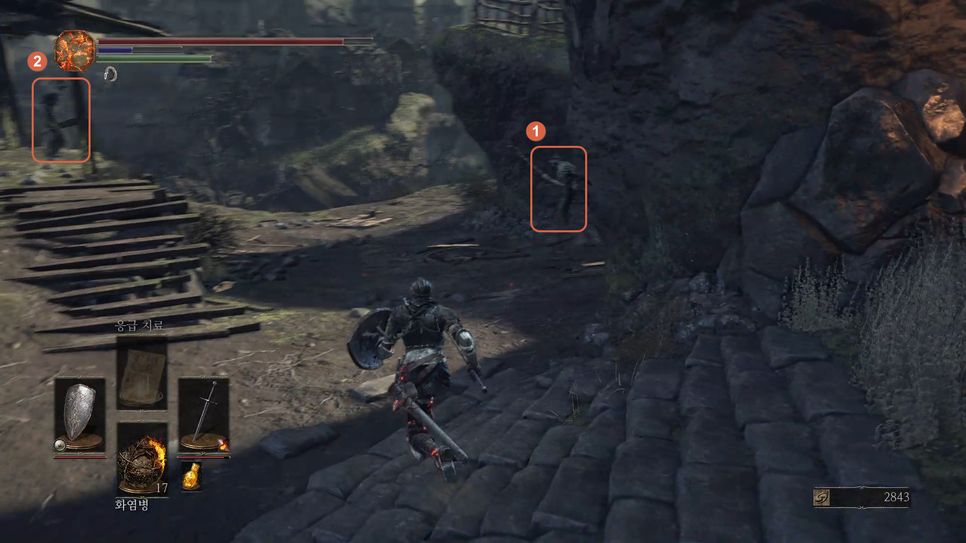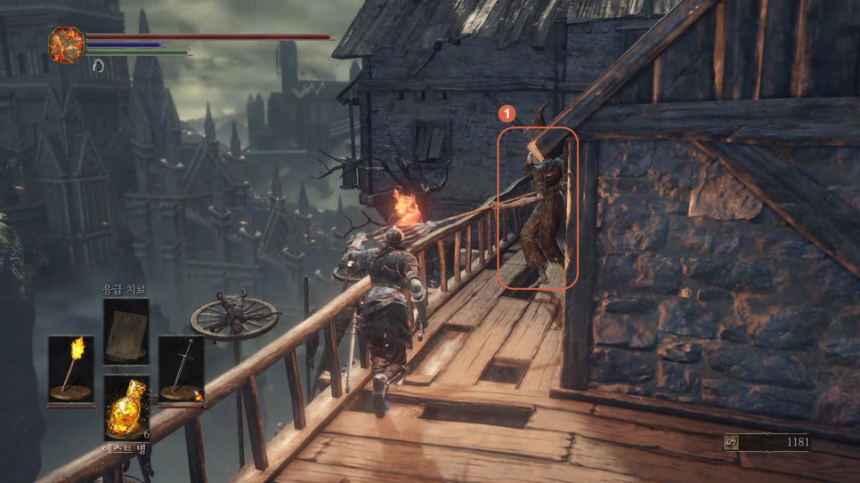 이제 다리가 있는 방향을 보게되면 건물 위에서 화염병을 던지는 몹들(1,2번)이 있습니다.
