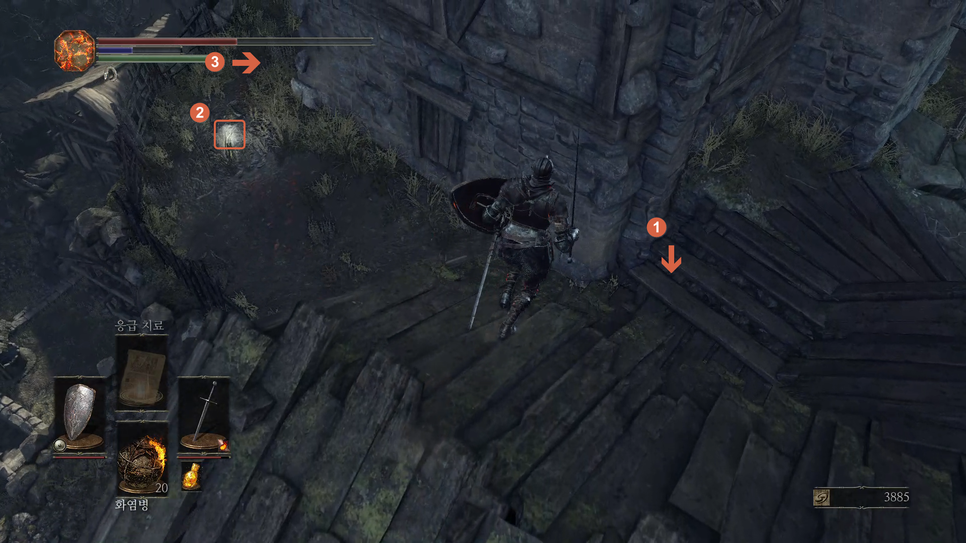 1번 위치로 떨어져서 2번 "널판지 방패" 획득 후 3번 방향으로 갑니다.