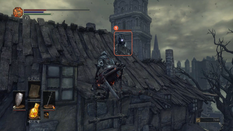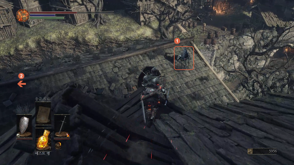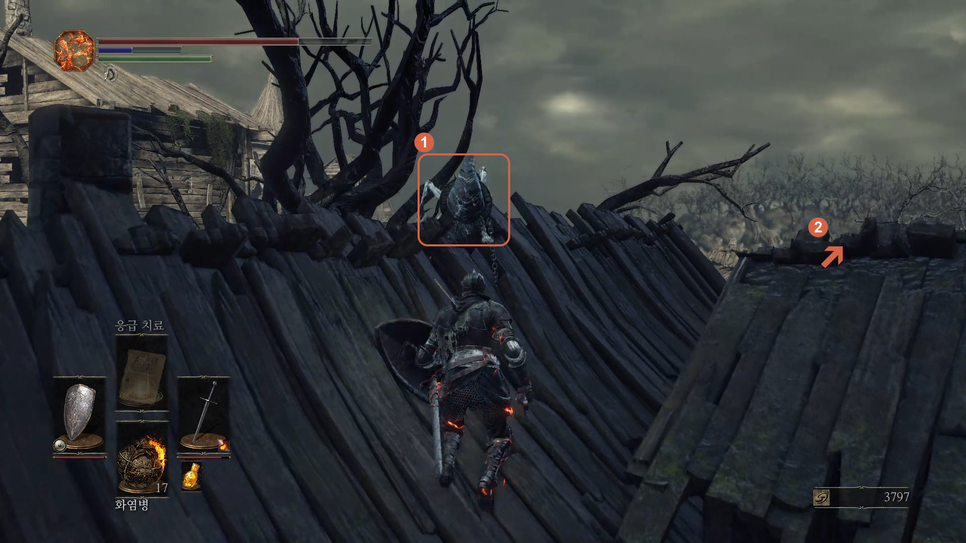 1번 몹을 처리하고 2번 지붕쪽으로 갑니다.