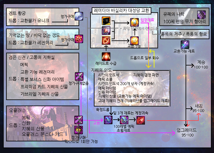 - (검은 수정 →) 지혜의 결정 파편(지혜의 인도 드롭) → 100개로 지혜의 결정 구매