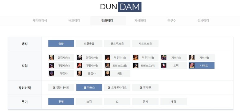 카오스는 딜러이므로 딜러랭킹을 클릭합니다. 이후 자신의 직업, 각성, 그리고 무기를 선택합니다. 가장 보편적인 지표를 보고 싶으면 위와 같이 맞춰주시면 됩니다.