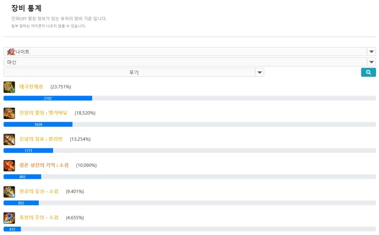 또한 고수 분들의 템세팅을 살펴보는 것 뿐만이 아니라, 전체적인 장비 사용 분포도를 통해 어떤 픽이 국룰인지 알 수 있는데요. 상단의 컨텐츠 -> 장비 통계를 클릭하시면 다양한 정보를 얻을 수 있습니다.