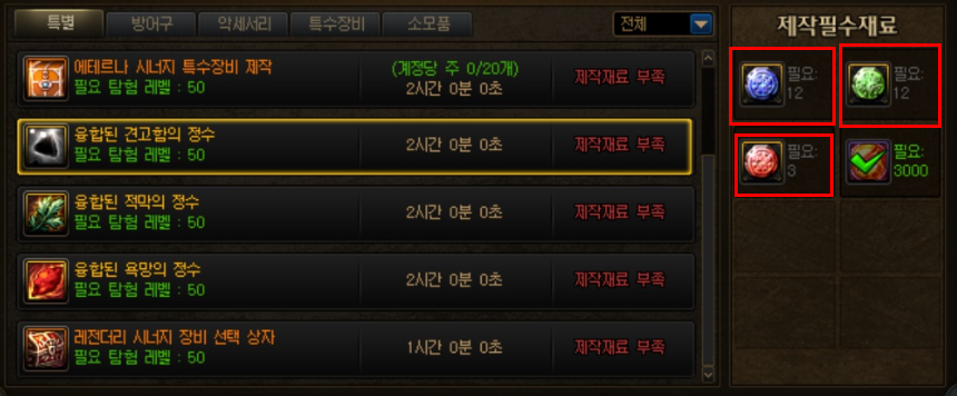 의 잔해물들이 각 1개씩 필요하며 방어구/악세/보법귀에 공통적으로