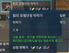 악기들은 착용할 수 있는 장비이므로 능력치가 붙어있습니다. 이것은 악기마다 다를 수 있습니다.