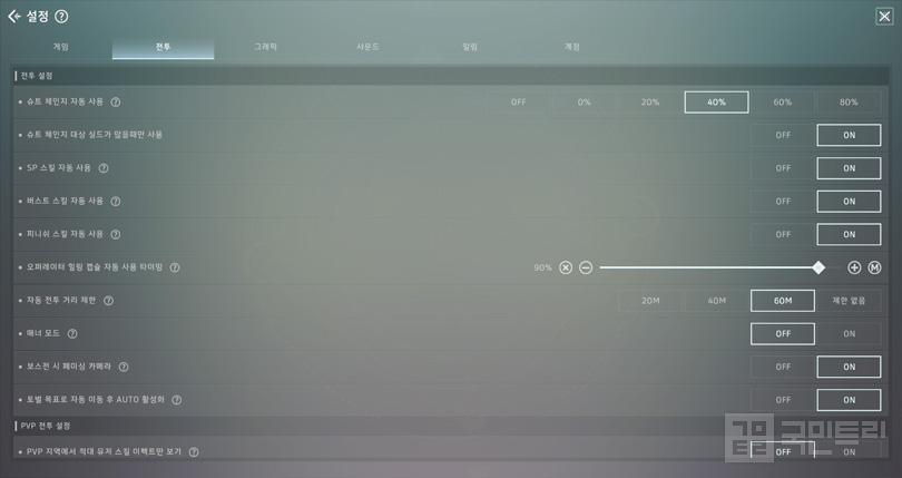 ▲ 슈트 체인지, 힐링 캡슐 사용 비율을 설정 (사진: 국민트리 촬영)환경 설정에서 다양한 전투 옵션을 설정할 수 있는데, 이를 활용해 전투를 보다 편하게 이용할 수도 있다. 슈트 체인지 자동 사용은 슈트의 잔여 실드량 비율에 따라 발동한다. 슈트를 고르게 육성했다면 20~40% 정도로 설정하는 것이 좋다. 반대로 한 가지 슈트를 집중적으로 육성했다면, 슈트 체인지가 이뤄질 경우 바로 전투 사망까지 이어질 수 있기 때문에 꺼두는 것을 추천한다.