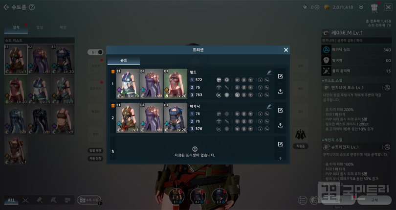 ▲ 상황에 맞춘 슈트 프리셋을 저장해 사용 (사진: 국민트리 촬영)아레스는 한 캐릭터에 슈트를 총 3개 착용할 수 있다. 이에 대부분의 유저가 각기 다른 유형의 슈트를 착용하는데 초점을 맞춘다. 이렇게 유형을 고루 맞추는 건 좋지만, 각기 다른 속성의 유트를 착용하는 게 더 중요하다.