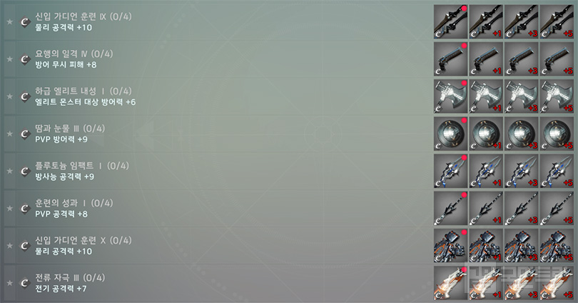 가디언 타워로 이동하면 힐링 캡슐 뿐 아니라 무기 상인에게서 C등급 주·보조무기 구매도 추천한다. 해당 장비들은 직접 쓰는 게 아닌, 무기 수집을 채우는 용도다. 개당 1만 골드라 부담이 적고 안전 강화 이내로 달성할 수 있는 수집 항목도 있다.