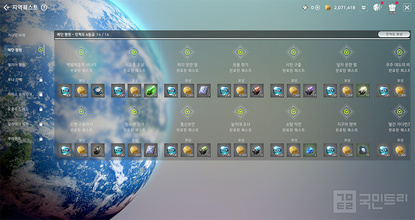 ▲ 지역퀘스트로 다양한 제작 재료 수급 (사진: 국민트리 촬영)아레스에는 스토리의 중심이 되는 ‘메인퀘스트’와 각 지역마다 수행할 수 있는 ‘지역퀘스트’가 있다. 그런데 일부 유저들이 빠른 진행을 위해 지역퀘스트는 최소한으로 하고 넘어가곤 한다. 결론부터 말하면 어느 정도는 신경 써야 한다. 지역퀘스트 진행 시 보상으로 각종 제작 재료를 받는데, 이를 모으면 A등급 장비를 제작하는 양이 된다. 참고로 장비 등급은 C가 가장 낮고, 이후 B~SR까지 있다.