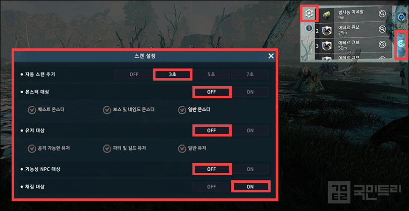 스캔 기능은 우측 상단 퀘스트 아래에 있는 아이콘을 눌러 확인할 수 있다. 톱니바퀴 모양의 아이콘을 누르면 스캔 대상을 설정할 수 있는데 여기서 모든 대상을 끄고 ‘채집’ 아이템만 켜두자. 그리고 자동 스캔 설정 주기를 가장 짧은 3초로 하면 세팅은 끝난다. 필요한 채집 아이템이 있는 필드로 가서 스캔 목록의 타깃을 터치하면 자동으로 찾아가 채집한다. 현재 위치에서 가장 가까운 순서로 대상을 자동 탐색하므로 순서대로 누르면 된다. 더불어 각 필드마다 등장하는 채집 아이템이 정해져 있으니 퀘스트를 진행하면서 미리 훑고 이동하는 것을 추천한다. 재료 수급을 위해 다시 돌아오는 동선을 최소화하는 방법이다.