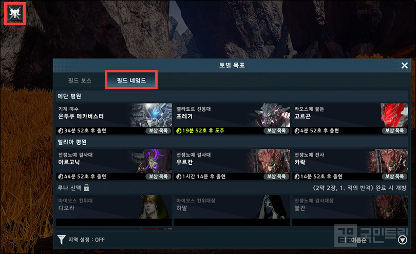 ▲ 필드 네임드의 출현 시간을 체크할 수 있는 ‘토벌 목표’ 기능 (사진: 국민트리 촬영)