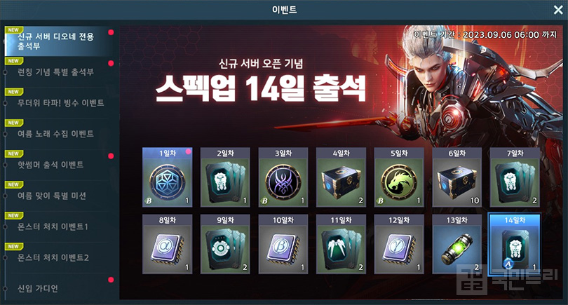 ▲ 디오네 서버 전용 출석 이벤트 (사진: 국민트리 촬영)9일, ‘아레스 : 라이즈 오브 가디언즈(이하 아레스)’가 신규 월드 ‘디오네’를 추가하고, 해당 서버만의 특별한 이벤트를 시작했다. 더불어 신규 시스템 ‘고급 옵션 변경’을 선보였으며, 여름 기념 행사도 다수 열었다.