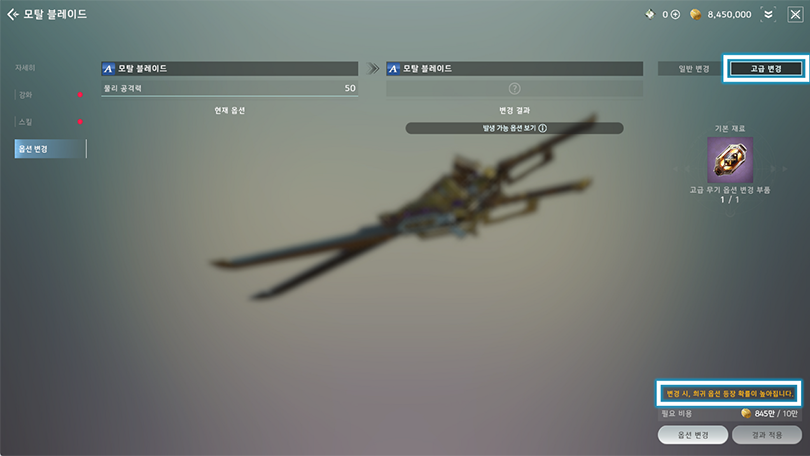 ▲ 신규 시스템 ‘고급 옵션 변경’ (사진출처: 아레스 공식 카페)주무기, 보조무기, 성물 옵션 변경에 신규 시스템 ‘고급 옵션 변경’도 추가했다. 기능 사용 시 옵션 변경으로 희귀 옵션이 등장할 확률이 더 오른다. 여기에는 고급 무기·성물 옵션 변경 부품이 필요하다. 이 기능은 A등급 이상부터 진행할 수 있다.