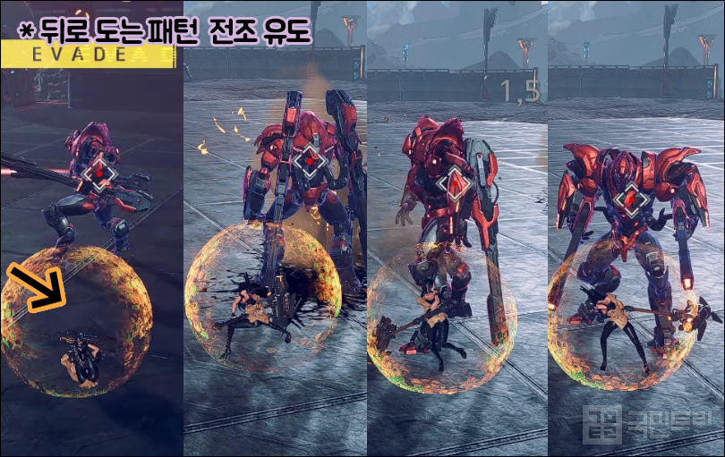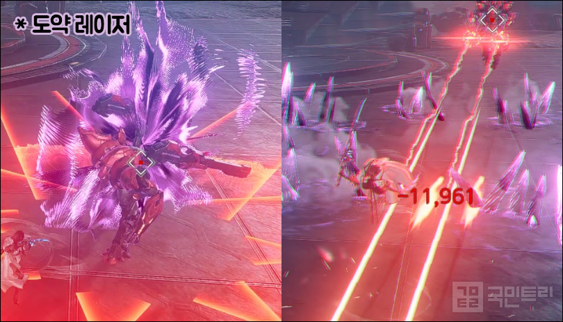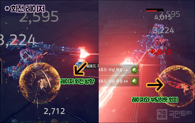 ▲ 회전 레이저 회피 방법 (사진: 국민트리 촬영)회전 레이저 역시 패턴이 겹치면 까다로운 공격 중 하나다. 전조는 킬러봄바드가 들고 있는 총을 견착한 뒤 앉는 자세를 취하는 것이다. 이후 레이저를 쏘면서 시계 방향으로 회전하고, 회전 방향과 동일하게 움직이거나 회피하면 치명상을 입을 확률이 높다. 레이저 공격과 부딪힌다는 생각으로 방향을 잡고 회피하는 게 가장 좋다. 마치 레이저를 뚫고 지나는 느낌으로 과감히 뛰어들자. 여기에 8방향 광역기가 겹쳐지면 레이저는 회피해도 광역기에 피해를 입을 위험이 크다. 가능하다면 회피보다 슈트 체인지나 버스트 스킬을 이용하자.