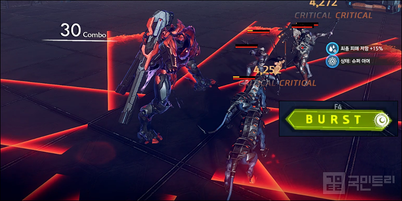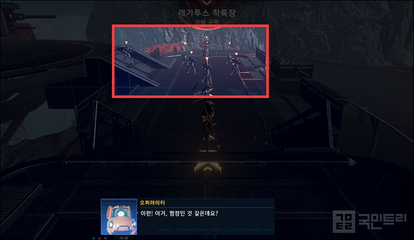 ▲ 함정? 오히려 좋아 (사진: 국민트리 촬영)이번 보스전은 오퍼레이터가 함정임을 의심하며 레가투스 병사를 토벌하는 것으로 시작한다. 보스전에서 실패한 뒤 재도전을 하더라도 이 구간을 반복해야 하기에 계속 상대하기가 버거울 수 있지만, 이를 역이용할 수도 있다. 몬스터를 모두 제압하면 착륙장에서 보스와 조우하는데, 사전에 버스트 게이지를 모으는 수단으로 활용하는 것이다. 다만, 전투력이 낮다면 병사 제압조차도 어려울 수 있다. 이 경우에는 이어질 보스전을 감당할 수 없기에 전투력을 조금 더 올린 후 도전하는 것을 권한다.