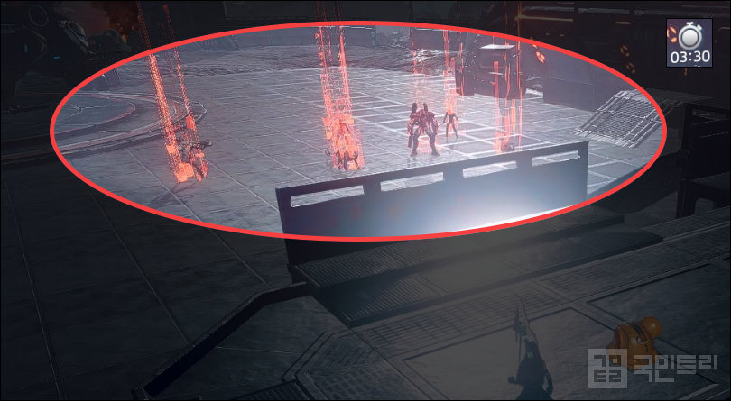 ▲ 아래층으로 내려가는 순간 보스전이 시작된다 (사진: 국민트리 촬영)병사들을 모두 제압하면 레가투스 강습병의 지시와 함께 아래층에서 일반 몬스터와 보스 킬러봄바드가 출현한다. 더불어 보스전 공략의 제한 시간인 3분 30초 타이머가 작동한다. 조급하게 내려가지 말고 15초가량 실드를 채우거나 스킬 쿨타임을 기다린 뒤 차분히 진입하자. 앞서 버스트 게이지를 채웠기에 3분이면 충분하다. 또한, 보스의 정면이 아니라 돌아가면 원거리 몬스터를 떼어내 잡을 수 있다. 단, 이 방법은 전투력이 낮다면 추천하지 않는다. 일반 몬스터에게 스킬을 소모하면 킬러봄바드 제압에 시간이 모자랄 가능성이 높아진다.