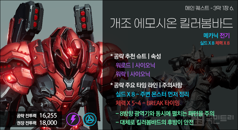 킬러봄바드의 체력 4~5줄 도달 시가 BREAK로 인한 그로기 타이밍이다. 여기서 공격 욕심을 내 슈트 체인지를 남발하는 것은 금물이다. 이후 상황을 생각해 차분히 대미지를 누적시켜서 공략을 마무리하자. 이후 일반 몬스터가 나오는 구간이 한 번 더 등장하지만, 프라임 가디언 에스페라, 듀크와 함께 전투를 진행하고 시간제한도 없으니 마음 놓고 퀘스트 스토리를 즐겨도 좋다.