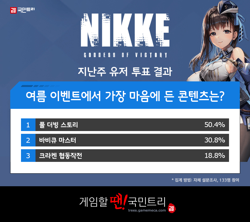 ▲ 풀 더빙 스토리가 1위를 차지 (자료: 국민트리 제작)지난주 여름 이벤트에서 가장 마음에 든 콘텐츠를 주제로 투표를 진행했습니다. 집계 결과 50.4%를 기록한 풀 더빙 스토리가 1위를 차지했네요. 반주년 OVER ZONE 이후 다시 돌아온 풀 더빙 스토리로, 1차 이벤트보다 니케들의 매력이 더 잘 전달됐습니다. 현재 본격적인 이야기가 진행되고 있으니 성우들의 열연과 함께 스토리를 감상해 보세요.