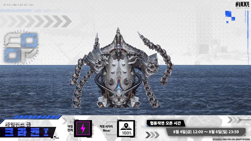 ▲ 이벤트 한정 협동작전 보스 크라켄 (사진출처: 승리의 여신: 니케 공식 라운지)여름 이벤트 기간에 협동작전 크라켄이 펼쳐지고 있습니다. 2회차 크라켄은 전격 코드이며, 11일부터 13일까지 토벌할 수 있죠. 차주에 나타나는 크라켄은 철갑 코드로 등장할 예정이니 상성 코드 니케를 확인한 후 다른 유저와 힘을 합쳐 보세요.