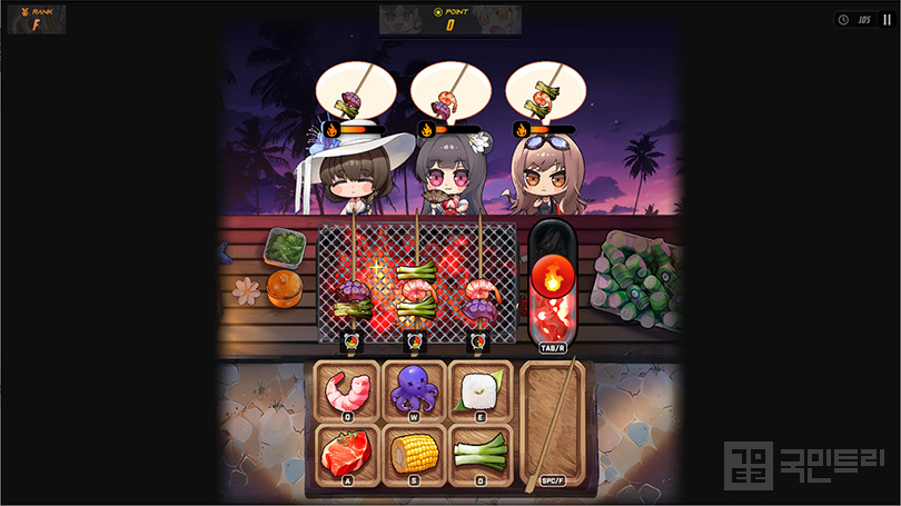 ▲ 미니 게임 고득점은 모바일보단 PC로 (사진: 국민트리 촬영)2차 여름 이벤트에서 미니 게임 ‘바비큐 마스터’가 추가됐죠. 120초간 방문하는 니케들의 주문에 맞춰 꼬치구이를 만들어 제공하면 됩니다. 재미는 물론, 점수 보상도 있어 고득점을 목표로 반복 플레이하는 유저들이 많죠. 이에 미니 게임 관련 팁이 공식 라운지에 속속 올라오고 있습니다.