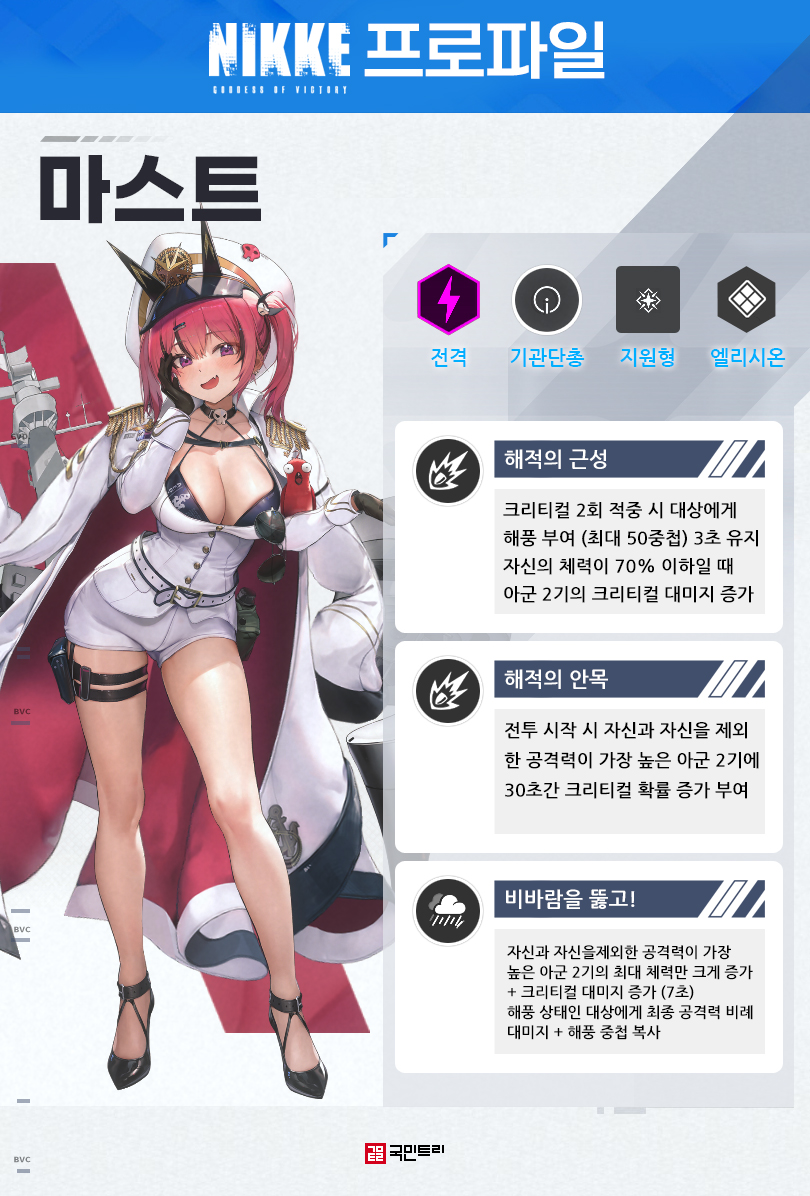 ▲ 해군이면서 해적 콘셉트의 니케 마스트 (자료: 국민트리 제작)오늘의 주인공은 엘리시온 소속 마스트입니다. 해군 콘셉트 스쿼드 이지스의 구성원이죠. 어릴 적 ‘카스피안의 해적’이라는 영화를 보고 해적을 꿈꿨지만, 해군밖에 없는 방주의 사실을 알고 충격을 받은 일화가 있습니다. 스쿼드에서는 특유의 발랄함을 앞세워 분위기 메이커로 활약하고 있죠. 같이 생활하고 있는 빨간 앵무새 모건도 굉장한 존재감을 자랑합니다.