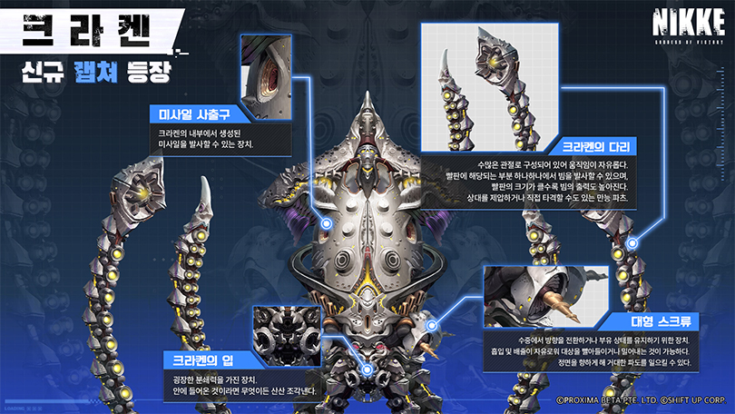 ▲ 이번에 새로 등장한 보스 랩쳐 크라켄 (사진출처: 승리의 여신: 니케 공식 트위터)다음은 이번에 처음 모습을 드러낸 타일런트급 랩쳐 크라켄이다. 설정상 1차 랩쳐 침공 이후 100년 만에 나타났으며, 그 크기는 무려 섬을 통째로 감고도 남을 정도다. 이에 맞서 유저들은 지난 8월 4일부터 6일까지 크라켄을 상대로 협동작전을 진행했다.
