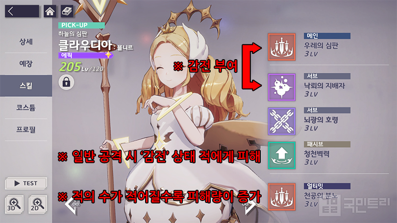 지난 29일 에버소울 신규 정령 클라우디아가 등장했습니다. 아드리안의 등장 이후 처음 추가한 천사형 정령이지만, 사실 메인 스토리에서 얼굴을 자주 비춰 익숙한 친구죠. 항상 눈을 감은 듯 웃고 있는 모습으로 인게임에서 굉장히 강력한 정령이란 언급도 나옵니다. 유저들이 소위 말하는 ‘실눈 캐릭터’ 포지션이죠. 그리고 마침내 플레이어블 캐릭터로 나온 클라우디아는 매우 강력한 감전 관련 효과를 갖추고 있었습니다. 신규 천사형 정령 클라우디아를 국민트리가 분석했습니다.