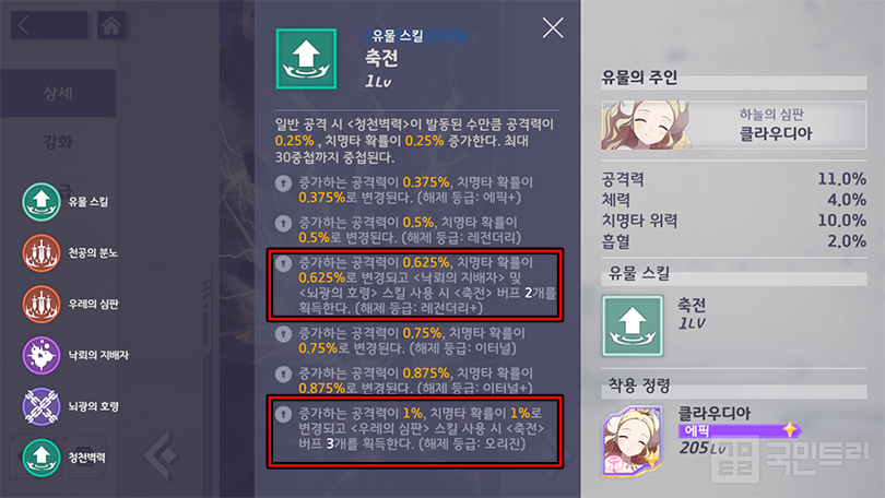 다음은 전용 유물 ‘묠니르’입니다. 유물 스킬 ‘축전’은 앞서 소개한 패시브 청천벽력이 발동한 횟수만큼 공격력, 치명타 확률이 최대 30회까지 중첩됩니다. 패시브 발동 횟수 당 에픽 등급은 0.25%, 오리진 달성 시 1% 올라 이론상 7.5%~30% 공격력과 치명타 확률 증가 효과를 누릴 수 있습니다. 레이드보단 다수를 상대하는 스테이지에서 금방 스택이 쌓이는 구조죠.