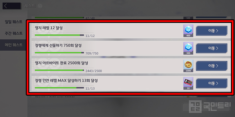 ▲ 첫 번째 문단의 공략을 따라하면 메인 퀘스트 달성이 가까워진다 (사진: 국민트리 제작)공략의 요지는 아르바이트를 많이 해 선물 공세를 펼치는 것이다. 이 과정에서 한 가지 부산물이 따라온다. 위 이미지를 보자. 로비에서 퀘스트 버튼을 누르고 메인 퀘스트 화면으로 넘어간다. 그럼 영지 활동 관련 과제 목록이 나온다. 영지 레벨과 선물 및 아르바이트 완료 횟수에 따라 다양한 보상을 준다.