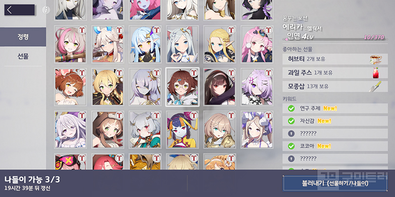 ▲ 기회가 있을 때 미리 준비해두자 (소스출처: 공식 유튜브 촬영)끝으로 어떤 정령부터 선물을 줘야 할지 정리해 보자. 여기서는 캐릭터의 인연 스토리와 인연 레벨만 기억하면 된다. 우선도는 전자가 조금 더 높다. 인연 스토리와 엔딩을 모두 감상하면 일반 소환권을 총 9개 얻는다. 일일 퀘스트 등으로 얻는 걸 더하면 10회 소환 분량이 모인다. 두 번째는 인연 레벨 9 달성 여부다. 뭐가 됐든 엔딩을 본 정령에게 선물을 줘 애정도를 최대치로 높인다. 인연 레벨 9 정령은 나들이와 선물 등으로 얻는 애정도가 2배이므로 생각보다 쉽다.