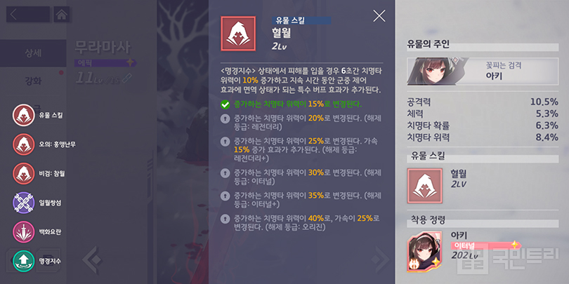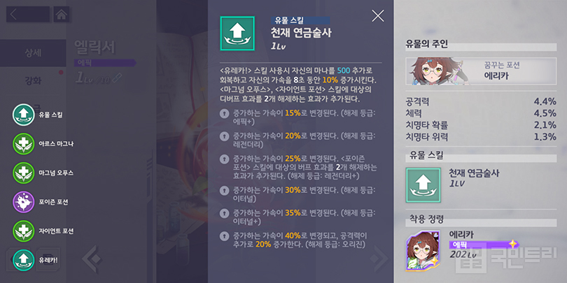 ▲ 에리카 같은 유형은 정령보다 유물 승급이 더 중요하다 (사진: 국민트리 촬영)수집할 유물 우선도는 정령 티어와 비례한다. 유물 옵션은 정령의 성능 및 기믹 강화에 특화하기 때문이다. 가령 벨라나는 흡혈 상태인 적을 공격할 때 확정 치명타가 발생하는 기믹이 있다. 그래서 유물 옵션으로 치명타 위력 증가를 받았다. 메피스토펠레스는 적의 치명타 피격 확률을 높이는 디버프 스킬에 방어력 감소 효과를 추가한다.