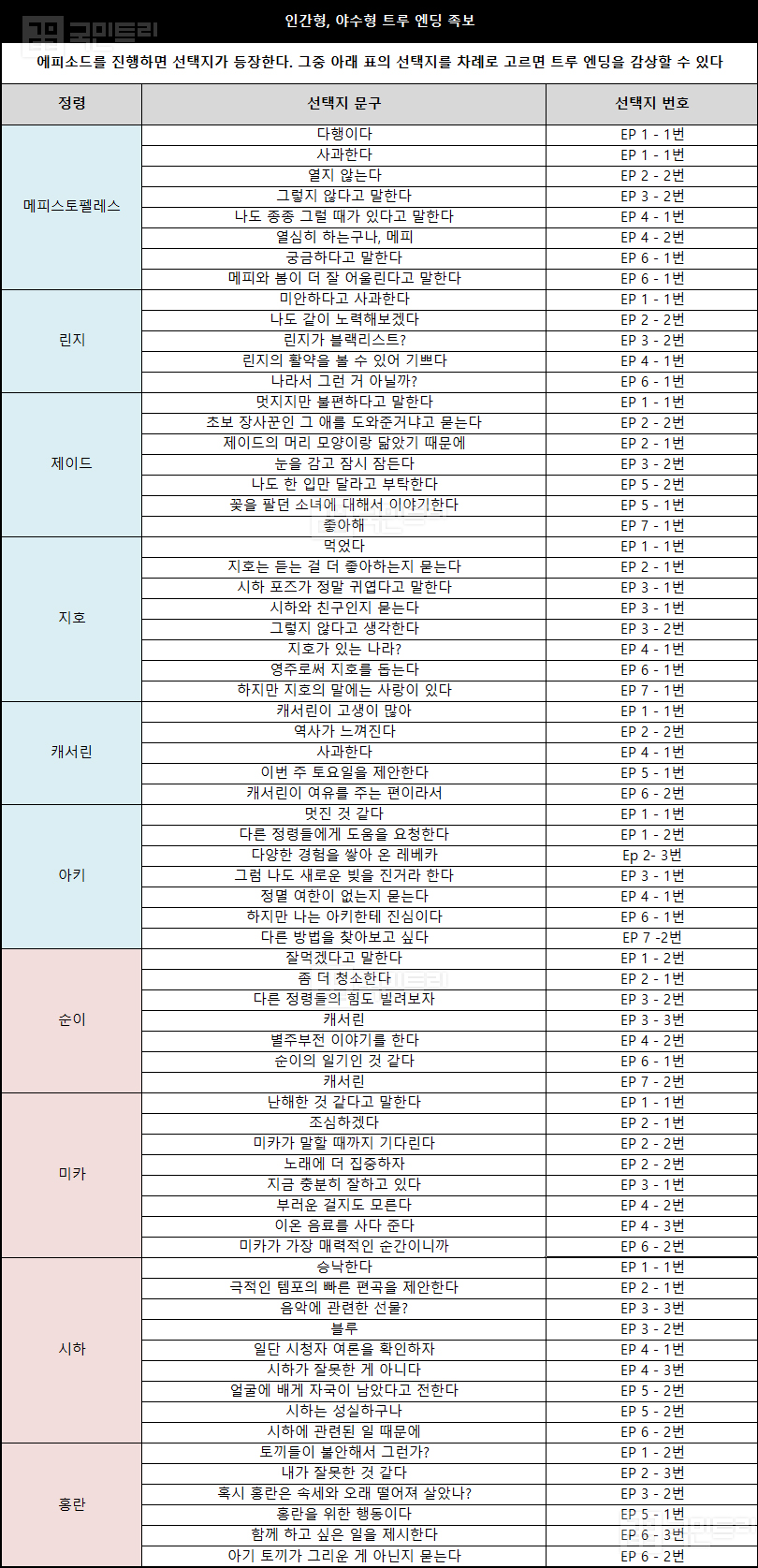 ▲ 노멀, 배드 엔딩은 선택지를 일부러 잘못 고르면 된다 (자료: 국민트리 제작)4월 25일 기준 트루 엔딩 족보 최신판이다. 최신 캐릭터 리젤로테까지 총 20명의 정보를 담았다. 일반 소환권 회수를 위해 노멀 엔딩을 보고 싶다면 1개 정도 오답을 고르자. 배드 엔딩은 오답을 더 많이 고르면 된다.