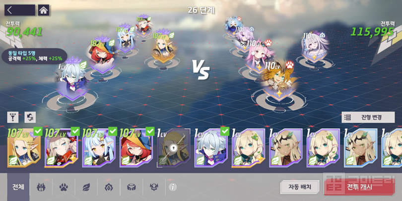 ▲ 포지션만 적당하면 107레벨 4명으로 30층까지 깰 수 있다 (사진: 국민트리 촬영)이곳을 공략하기 시작하면 타입별 정령 풀과 그동안 개방한 동기화 슬롯이 빛을 발한다. 층을 오를 때마다 에버스톤과 골드, 마나더스트, 유물석이 우르르 쏟아진다. 이렇게 얻은 재화로 핵심 정령을 키우면 된다. 동기화로 고레벨이 된 정령도 많이 필요하지 않다. 탱커를 맡을 정령과 딜러를 포함해 서너명 정도면 30층 언저리까지 쭉쭉 밀 수 있다.