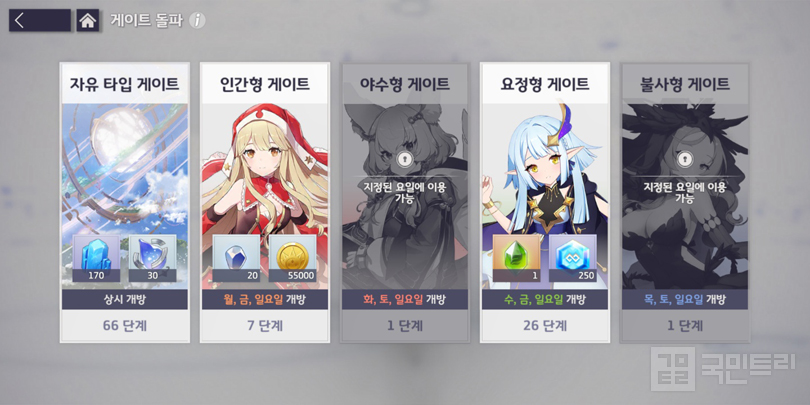 타입별 게이트는 ‘인간형 – 야수형 – 요정형 – 불사형’의 네 종류로 나뉘며, 특정 요일에 맞는 콘텐츠가 열리는 구성이다. 핵심은 이름에 맞는 타입 정령으로만 공략을 진행하는 점이다. 가령 요정형 게이트라면 요정형만 다섯 명 모아서 탑을 올라야 한다. 당연히 천사형과 악마형도 쓸 수 없다. 가능한 다양한 에픽 정령을 모으고 함부로 승급 재료로 쓰지 말라는 이유가 여기에 있다.