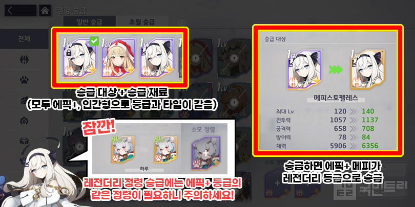 ▲ 이대로 승급하면 에픽+ 메피를 또 만들어야 하니 저레어 정령을 승급해 대신 쓴다 (사진: 국민트리 제작)그럼 저레어 정령은 왜 필요한 걸까? 이 또한 승급을 위해서다. 승급에는 꼭 대상과 같은 에픽 정령이 필요한 게 아니다. 가령 메피를 승급한다고 치자. 첫 승급은 같은 정령이 필요하지만, 레전더리 등급에 오를 때에는 같은 인간형 에픽+ 정령 둘이 필요하다. 이때 수급량이 많아 에픽+ 달성이 쉬운 저레어 정령을 쓰는 것이다.