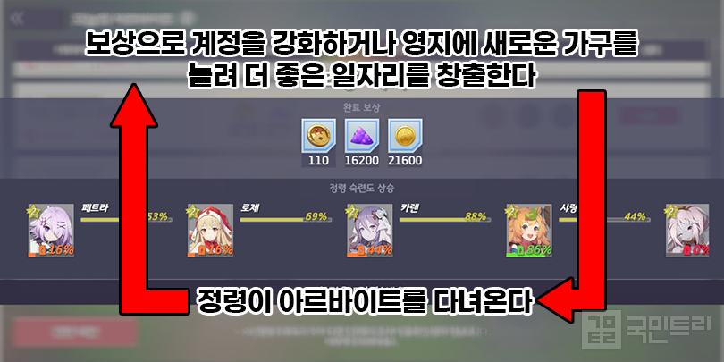 이때 중요한 건 정령의 숙련도다. 정령은 ‘지식 – 재주 – 담력 – 화술 – 교양’ 등 아르바이트 관련 스탯이 있다. 아르바이트를 보내려면 참가자의 스탯 합계가 최소 요구치 이상을 달성해야 한다. 요구치를 초과했다면? 무작위 추가 보상을 지급한다.