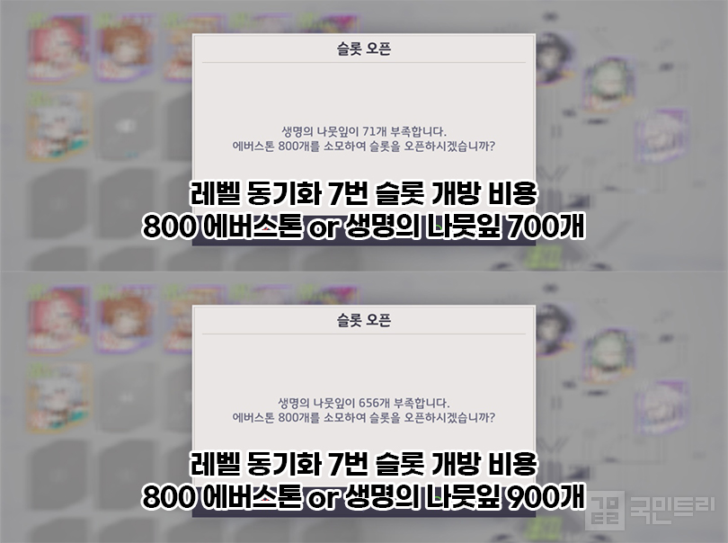 해당 고민을 하고 있다면 세 가지를 기억하자. 먼저 에버스톤을 써 동기화 슬롯을 여는 건 추천하지 않는다. 이유는 에버스톤과 생명의 나뭇잎 소모량 때문이다. 생명의 나뭇잎은 100부터 조금씩 늘어나 7번 슬롯을 열 무렵이면 700개가 필요하다. 그리고 8번을 열 때 900개가 소모된다. 이 정도는 전리품을 회수하거나 퀘스트를 달성하면 해볼 만 한 수치다. 다만, 에버스톤으로 슬롯을 뚫을 때에는 이야기가 다르다. 전 구간에서 800 에버스톤이 필요하다. 새로운 전투원이 필요하다면 방주에서 기존 정령의 레벨 초기화를 하는 게 낫다.