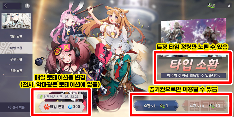 다만, 의외로 자주 이용하기 힘든 기능이 있다. 원하는 타입의 정령만 골라 뽑을 수 있는 타입 소환이다. ‘인간형 – 야수형 – 요정형 – 불사형’이 매일 로테이션을 돌며, 전용 뽑기권으로만 이용할 수 있다. 뽑을 대상을 크게 좁힐 수 있다 보니 ‘내가 뽑고 싶은 정령을 여기서 뽑아야지’라고 생각할 수 있지만, 크게 추천하지 않는 방법이다. 픽업 뽑기의 핵심은 승급 재료로 쓸 정령 파밍이기 때문이다.