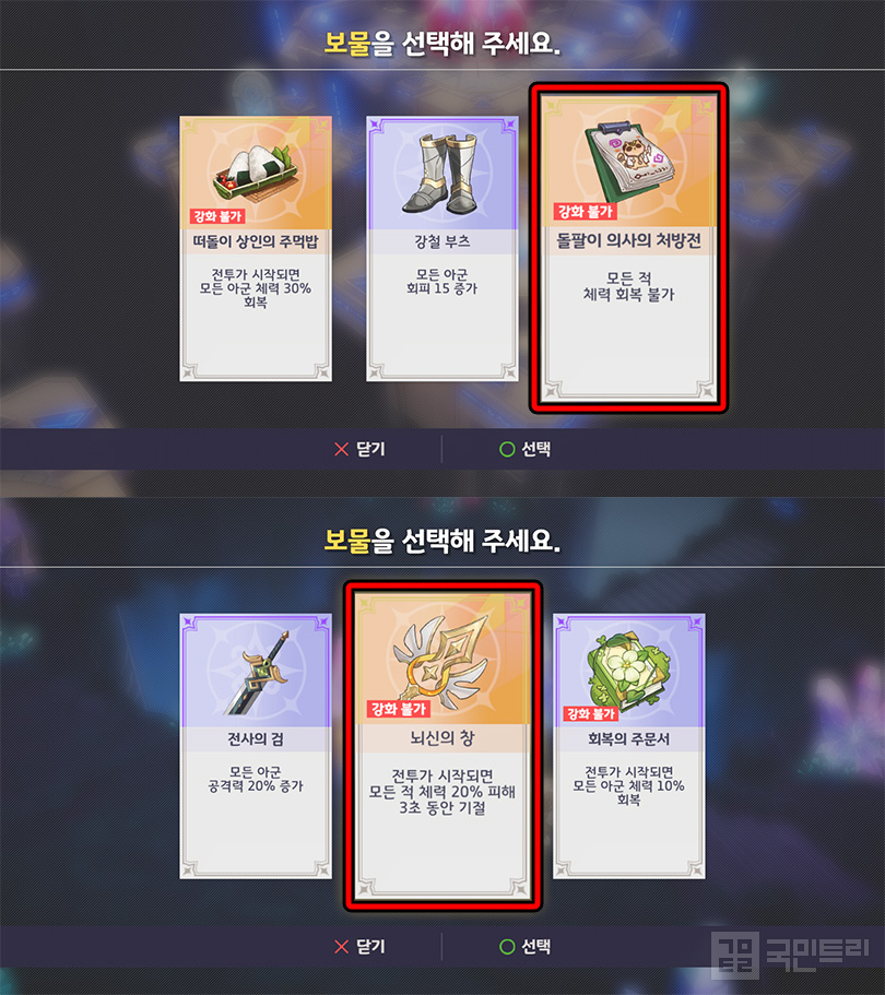 ▲ 처방전과 뇌신의 창을 얻으면 체감 난이도가 크게 낮아진다 (사진: 국민트리촬영)미궁 속 마물들을 쓰러트리면 보상과 함께 미궁에서만 적용되는 보물을 챙겨갈 수 있다. 이 중 전설 등급 ‘뇌신의 창’과 ‘돌팔이 의사의 처방전’이 등장하면 꼭 얻어 가길 바란다. 현재 적으로 만나면 가장 까다롭다는 평가를 받는 페트라와 클라라의 회복 능력을 원천 봉쇄하고, 시작부터 적 전체 체력의 20%를 깎고 추가로 기절까지 시키기 때문이다. 1, 2단계 보스를 클리어하면 전설 등급 보물이 무조건 등장하는데, 이때 해당 유물들을 챙겨가면 전투력 차이가 크게 나도 쉽게 미궁을 공략할 수 있다.