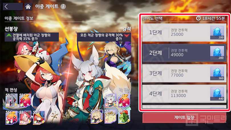 이중 게이트는 아군에게 유리한 버프와 적군에게 유리한 버프 2가지의 상황을 클리어하면 된다. 단, 2번의 전투에서 정령을 중복으로 사용할 수는 없다. 예를 들어 이미지 속 선봉장 공략에 재클린을 사용했다면, 강적 공략 시 재클린을 데려갈 수 없다. 때문에 적정 전투력에 맞는 2군 파티를 꾸릴 수 있어야 한다. 방주의 레벨 동기화를 이용해 주력 파티와 2군 파티를 짜 공략에 도전하자. 참고로 선택한 난이도를 도저히 공략할 수 없다면, 되돌리기도 가능하니 부담 없이 도전해 보자.