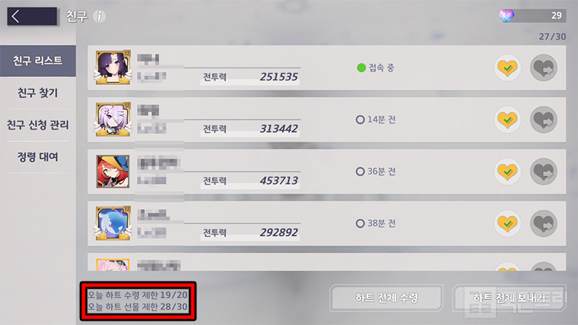 ▲ 매일 친구와 함께 서로에게 하트를 보내자 (사진: 국민트리 촬영)특히 친구 영지 임무 3회는 꼭 완료하는 게 좋다. 하트는 ‘우정 소환’에서 사용하는 전용 뽑기 재화로 10개에 1회, 100개를 모으면 10회 뽑기를 할 수 있다. 우정 소환은 일반 소환과 마찬가지로 모든 정령이 등장하며, 에픽 등급 정령을 얻을 수 있어 기회가 있을 때마다 돌리면 좋다. 하트는 매일 친구에게 20개씩 받을 수 있는데, 이를 활용하면 하루에 모이는 하트는 총 50개로 2일에 한번 10회 뽑기를 할 수 있으니 참고하자.