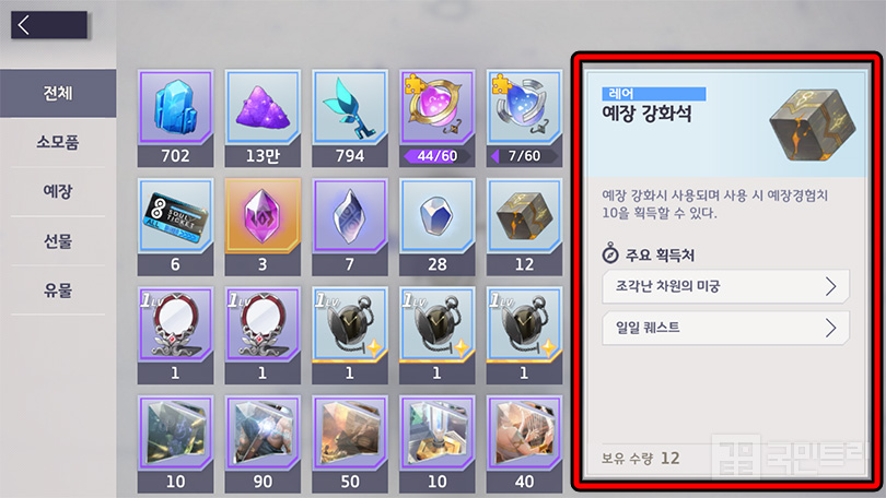 ▲ 예장 강화에 필요한 강화석을 대량으로 얻을 수 있다 (사진: 국민트리 촬영)일일 임무가 아닌 이틀에 한 번씩 초기화되는 콘텐츠도 있다. 바로 ‘조각난 차원의 미궁’이다. 타워식 던전 콘텐츠로 총 3단계로 구성됐다. 단계별 보스를 쓰러트리면 골드, 마나더스트, 에버스톤, 정령의 기억 등 성장 재화를 수급 가능하다. 특히 예장 강화에 필요한 ‘예장 강화석’을 대량으로 얻을 수 있는 유일한 루트다. 현재 진행 중인 ‘에덴 적응 훈련’ 이벤트 6일 차 퀘스트 ‘예장 10 레벨 최초 달성’을 위해서 꼭 잊지 말고 도전하자.
