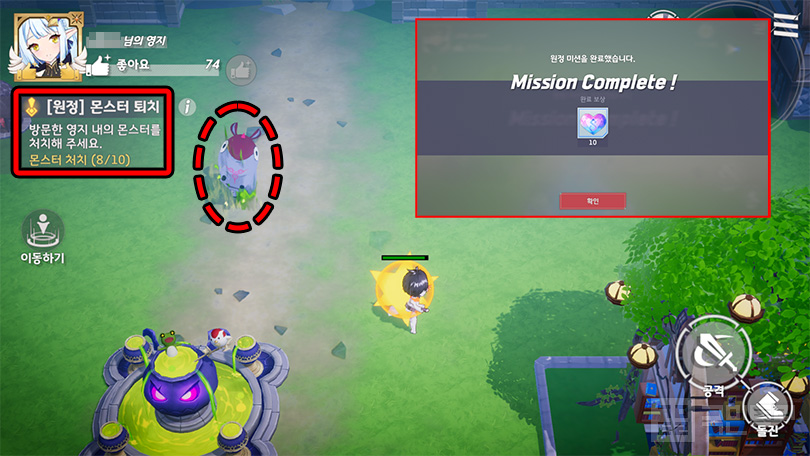▲ 친구 영지를 대신 청소하고 하트 보상을 얻자 (사진: 국민트리 촬영)접속해서 가장 먼저 할 숙제는 영지 방문이다. 개인 영지 낮, 밤 일일 임무와 친구의 영지를 대신 최대 3번 청소하는 임무다. 개인 영지 임무는 매우 심플하다. 낮에는 장해물 10개 파괴, 밤에는 몬스터 10마리 처치를 하면 끝이다. 보상으로 영지 코인을 100개씩 총 200개 얻고, 친구 영지 임무를 완수하면 ‘하트’를 10개씩 총 30개 지급한다. 영지의 밤과 낮은 현실 시간 4시간마다 돌아가며, 영지 시계를 통해 다음 전환까지 얼마나 남았는지 알 수 있다.