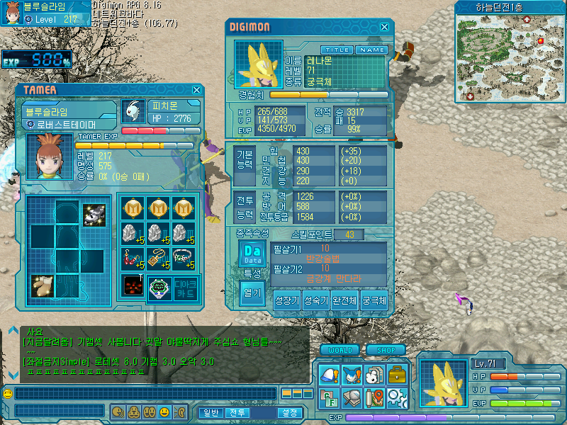 이번 5편에서는 로테만이 갈 수 있는 하늘던전 1층에서 v몹을 잡으며 세라피몬과 메탈에테몬을 71렙까지 올릴겁니다.