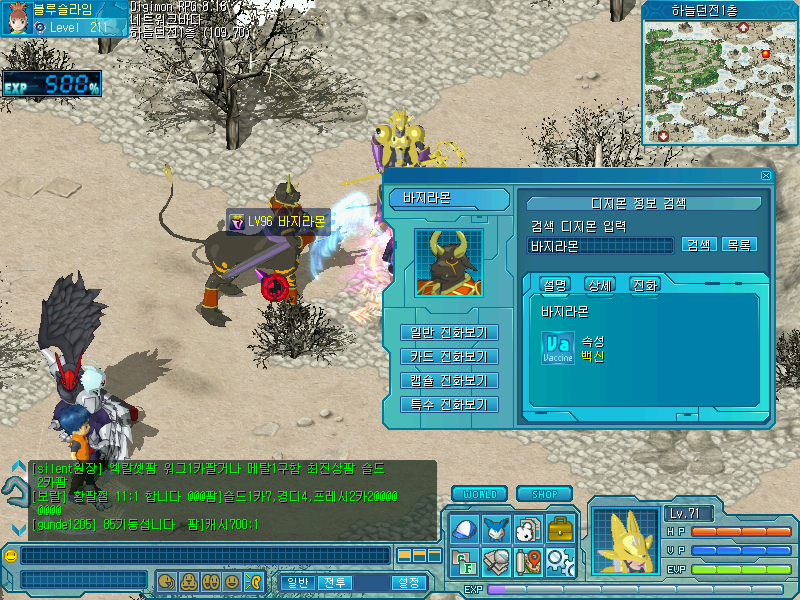 하늘던전 1층에서 96렙이 제일 높으며 그중에서도 백신인 바지라몬을 잡아주시면 됩니다.